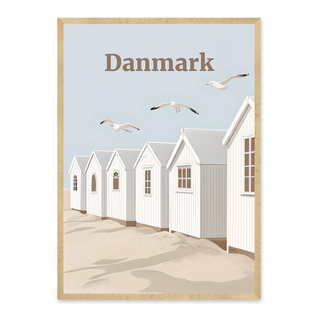 Danmark-plakat - Plakat föreställande en vit husvagn vid stranden