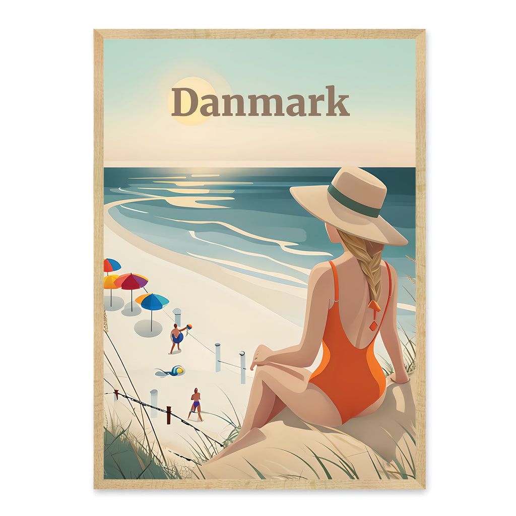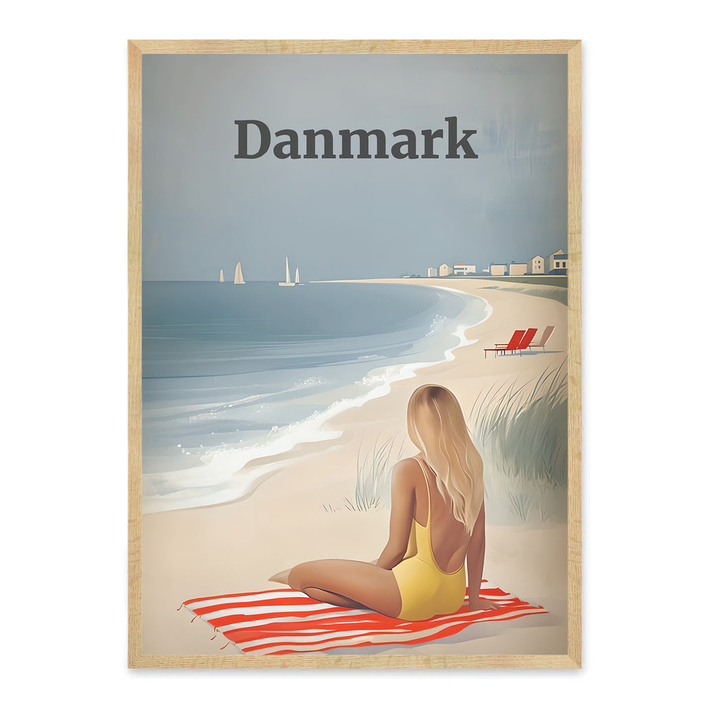 Danmark-plakat - Plakat föreställande en kvinna i gul badklänning på stranden