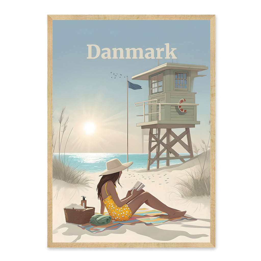 Danmark-plakat - Plakat föreställande en kvinna på stranden med solhatt och bok.
