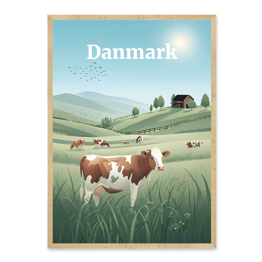 Danmark-plakat - Plakat föreställande gräsmarker med kor och en liten lada.