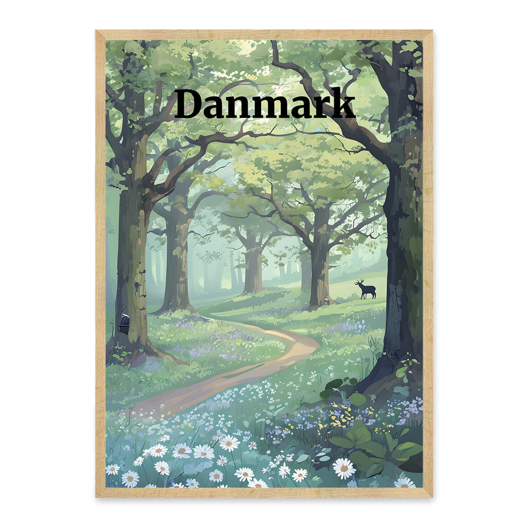 Danmark-plakat - Plakat föreställande en skog med å, gröna träd och ljusrosa knoppar