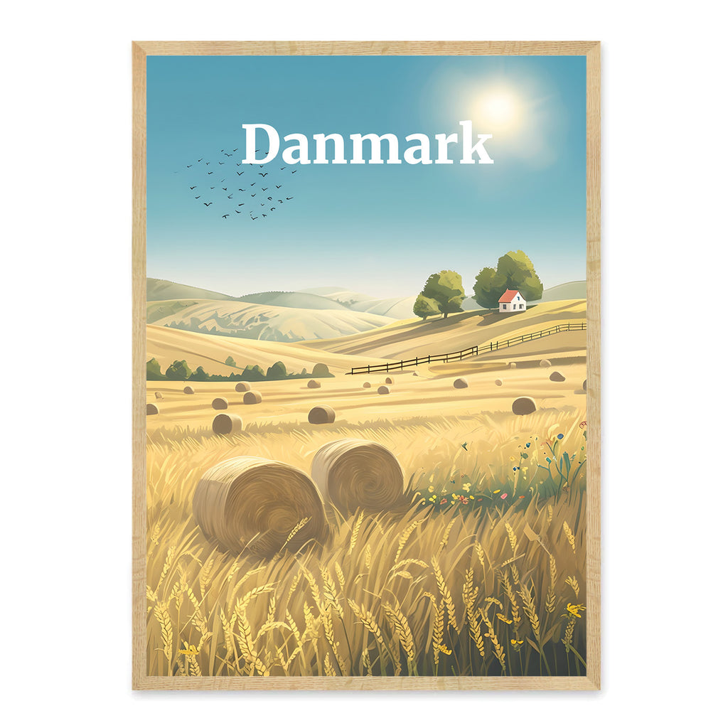 Danmark-plakat - Plakat av ett spannmålsfält med halmbockar och ett vitt hus.