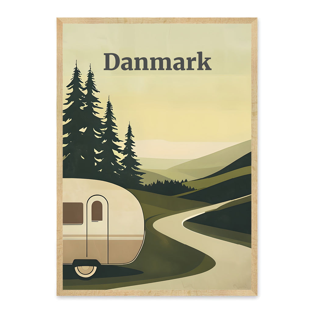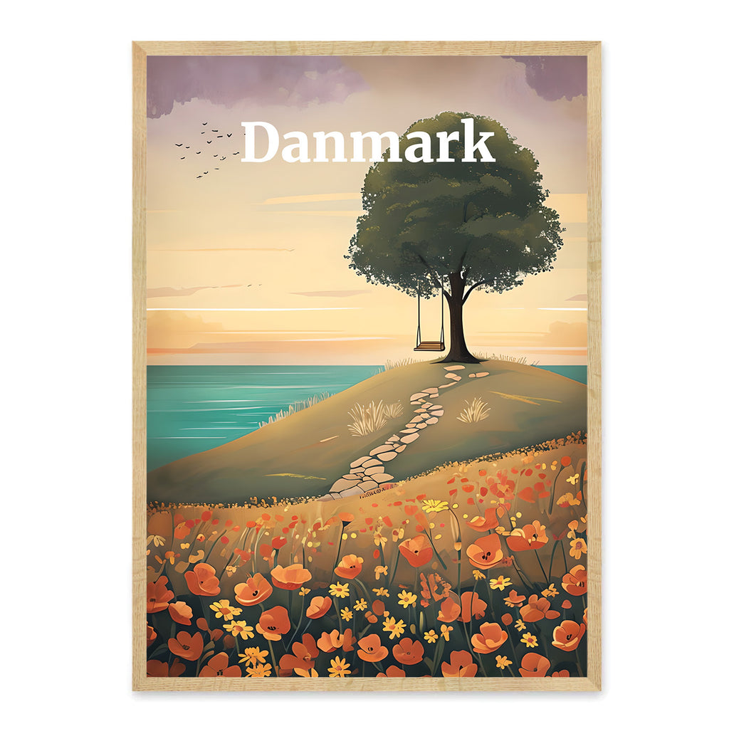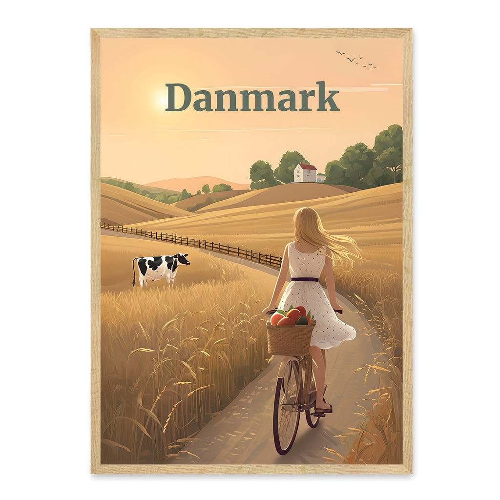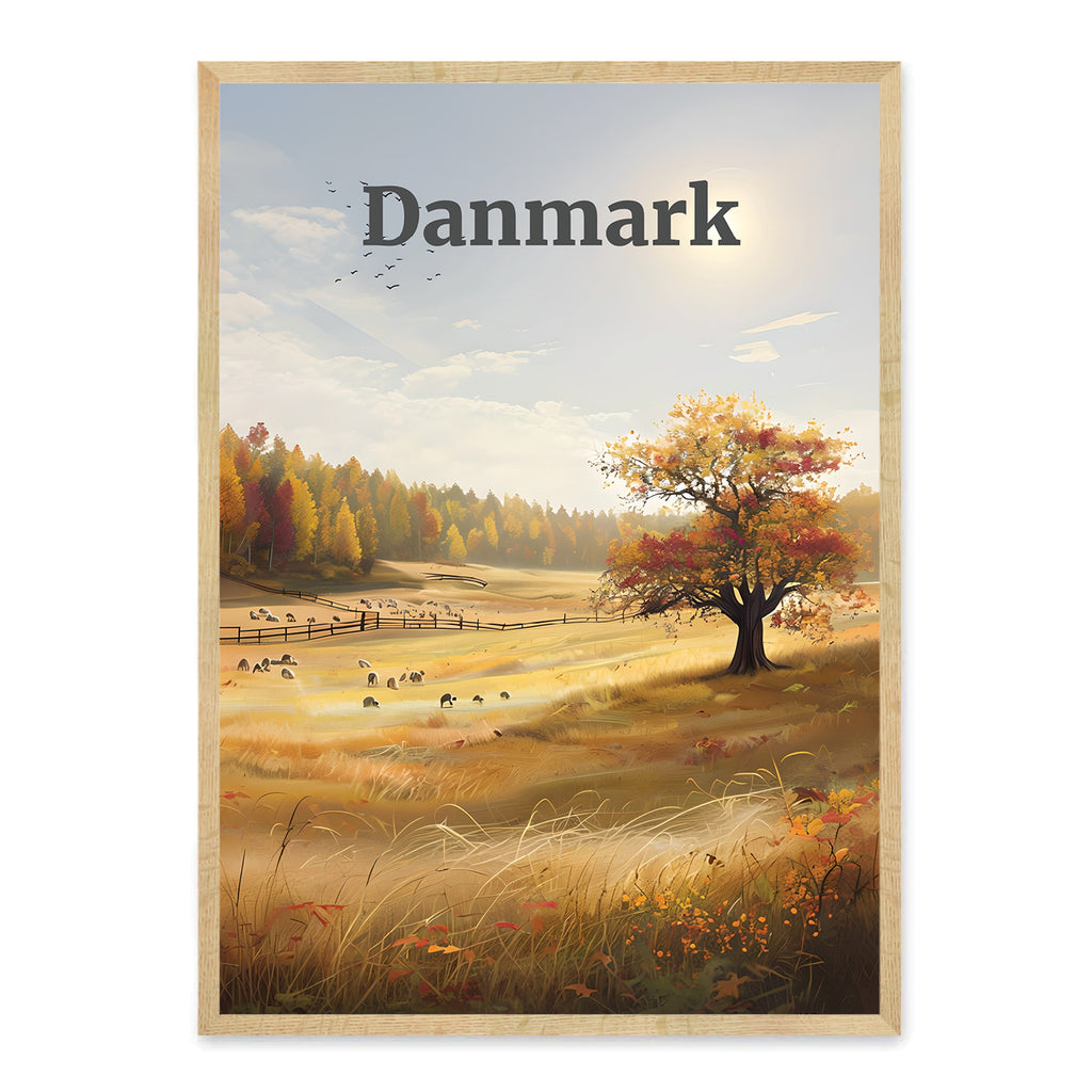 Danmark-plakat - Plakat föreställande ett höstlandskap med åkrar, får och hus.