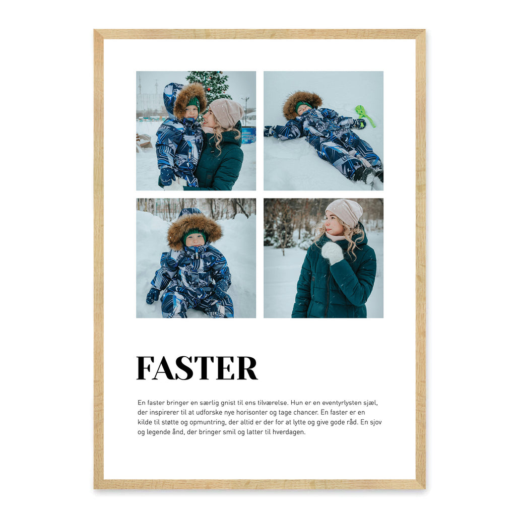 Vælg mellem et design med ét eller fire billeder, og tilføj en færdig tekst fra vores liste – eller skriv din egen. En rørende og betydningsfuld gaveidé til faster, som vil værdsætte en personlig og kærlig påmindelse om, hvor meget hun betyder for dig.