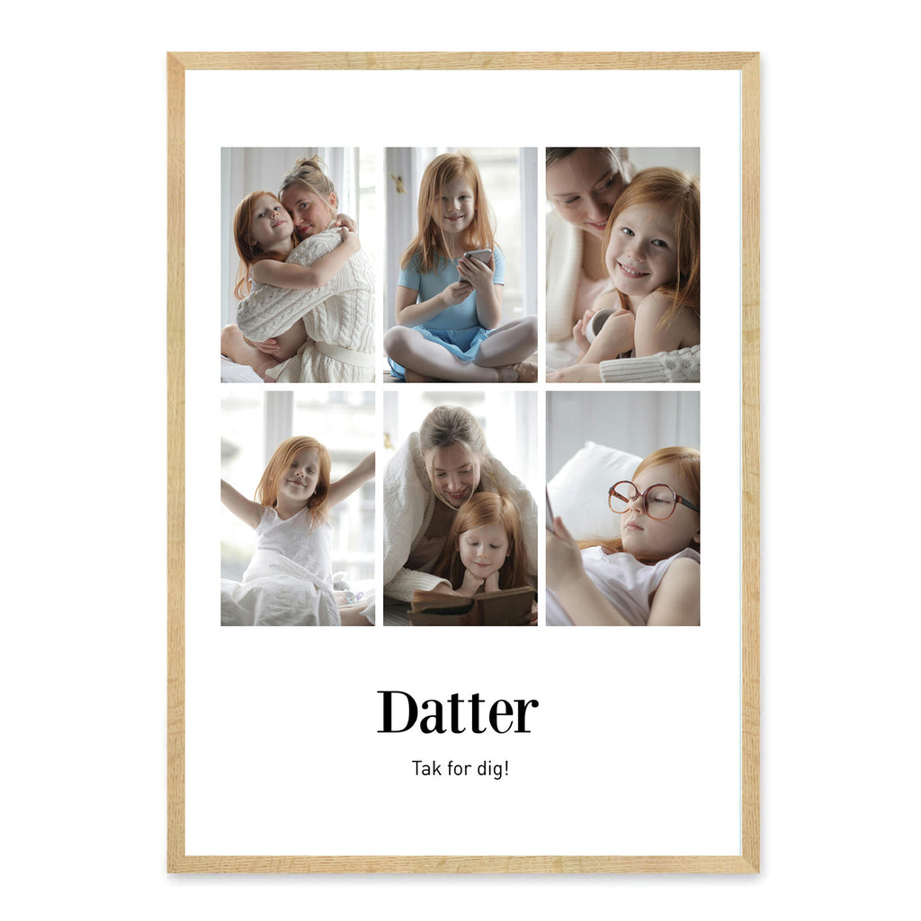 En datter bringer glæde, kærlighed og uforglemmelige øjeblikke ind i livet. Hun er både ven, støtte og en kilde til smil og latter hver dag. Plakaten hylder jeres særlige forhold og kan designes med 6 eller 9 billeder, en personlig titel og tekst, så den afspejler jeres unikke historie.