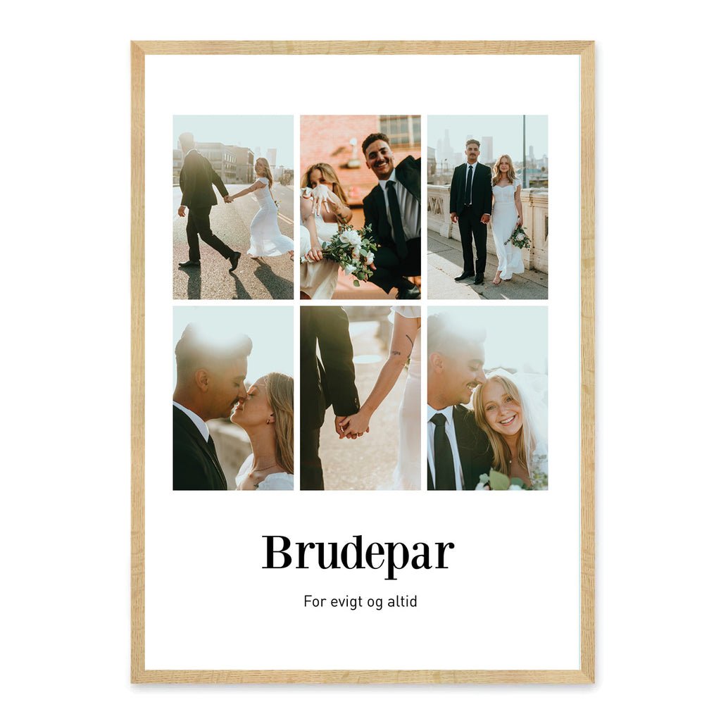 Et brudepar deler kærlighed, drømme og minder, der markerer starten på et nyt kapitel sammen. Denne plakat er skabt som en hyldest til jeres fælles rejse og de særlige øjeblikke, I allerede har oplevet. Plakaten kan designes med 6 eller 9 billeder, en personlig titel og tekst, så den afspejler jeres kærlighedshistorie på en unik måde.