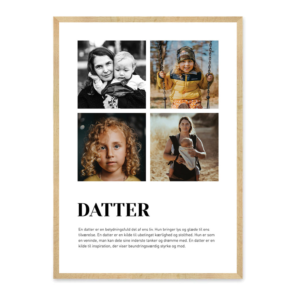 Vælg mellem et design med ét eller fire billeder, og tilføj en færdig tekst fra vores liste – eller skriv din egen. En rørende og betydningsfuld gaveidé til datteren, som vil værdsætte en personlig og kærlig påmindelse om, hvor meget hun betyder for dig.