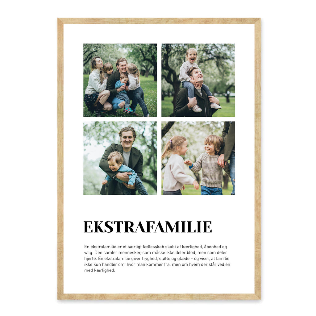 Vælg mellem et design med ét eller fire billeder, og tilføj en færdig tekst fra vores liste – eller skriv din egen. En rørende og betydningsfuld gaveidé til ekstrafamilien, som vil værdsætte en personlig og kærlig påmindelse om, hvor meget I betyder for hinanden.