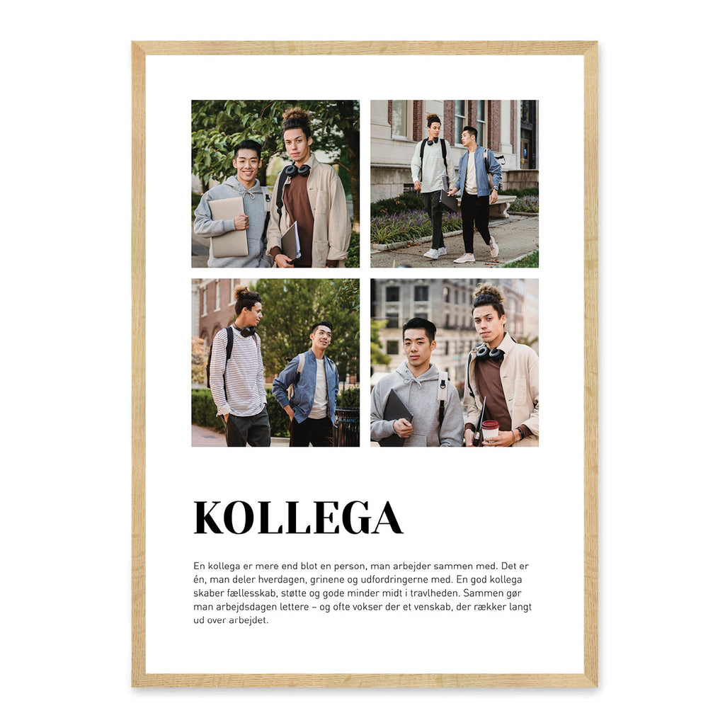 Du kan vælge mellem forudskrevne tekster om kollegaskab eller skrive din egen tekst, så budskabet bliver helt personligt. Upload ét eller fire billeder for at gøre plakaten ekstra mindeværdig.