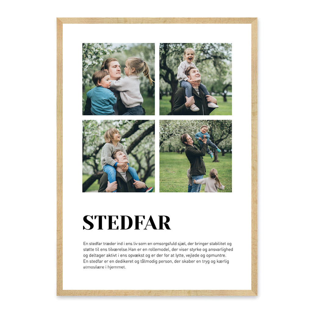 En Stedfar-plakat er en kærlig hyldest til den mand, der vælger at elske, støtte og være der – helt uden at skulle. Den minder os om, at faderskab handler om handlinger, nærvær og hjerte, ikke kun om blod.