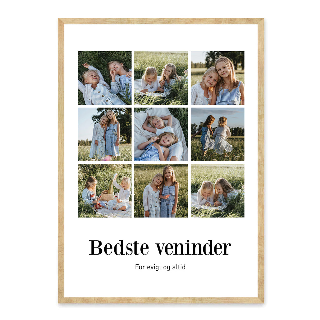Denne smukke plakat er skabt som en personlig og kærlig gave til din bedste veninde. Den fejrer det stærke venskab, de mange grin, hemmeligheder og uforglemmelige oplevelser, der binder jer sammen. Plakaten kan tilpasses med jeres egne 6 eller 9 billeder, en personlig overskrift og tekst, så den fortæller jeres helt unikke historie.