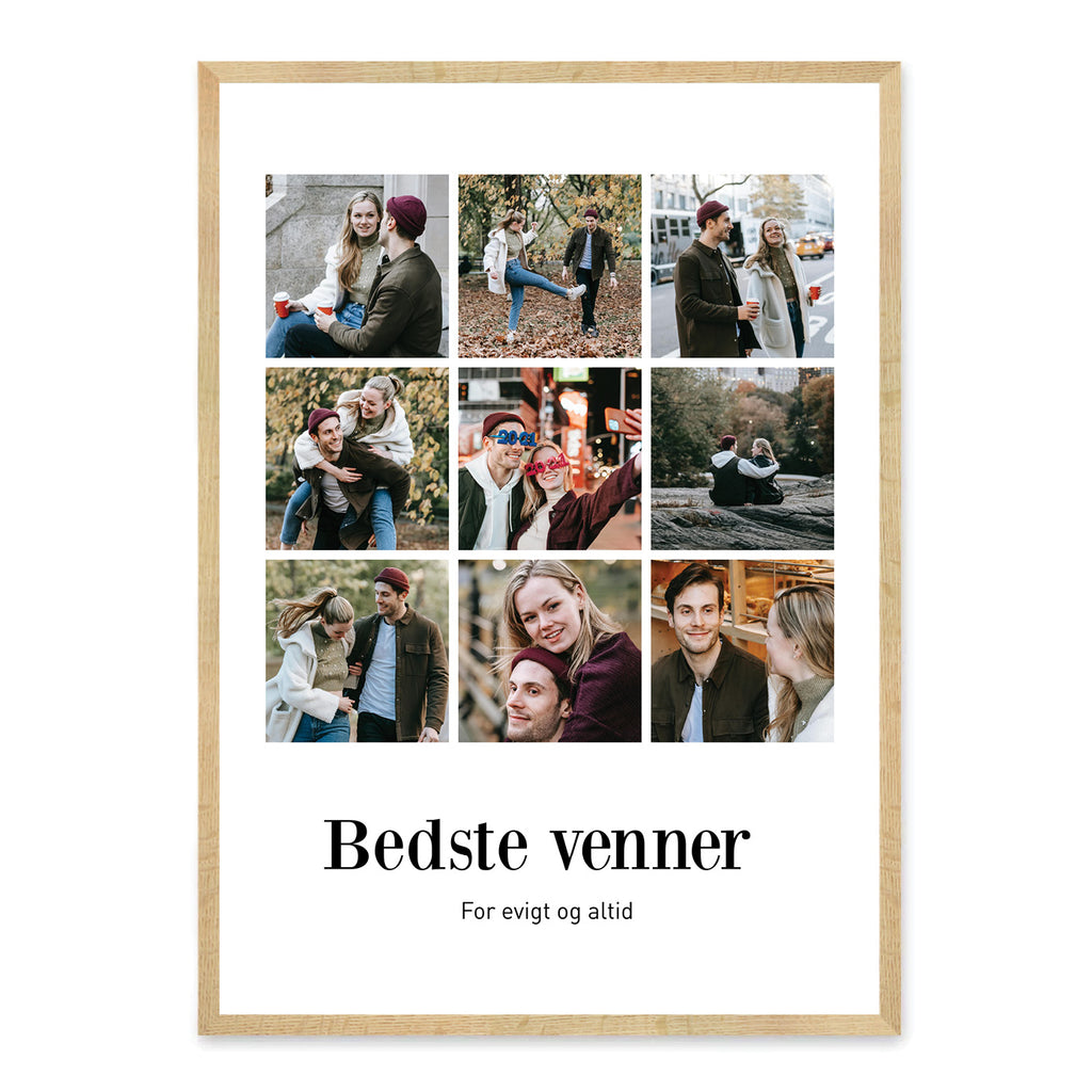 En personlig plakat designet til at fejre det tætte venskab mellem bedste venner. Den hylder alle de sjove, støttende og uforglemmelige øjeblikke, I har delt, og de minder, der gør jeres venskab helt særligt. Plakaten kan tilpasses med jeres egne 6 eller 9 billeder, en personlig overskrift og tekst, så den fortæller jeres unikke historie.