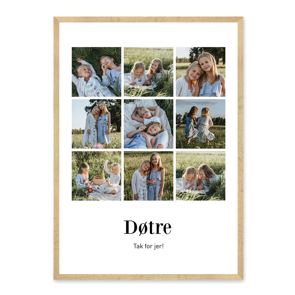 En farverig og kærlig plakat skabt til døtre, som hylder deres personlighed, energi og de minder, I deler sammen. Den kan fange alt fra grin i hverdagen til varme stunder og viser, hvor meget I betyder for hinanden. Plakaten kan tilpasses med jeres egne 6 eller 9 billeder, en personlig overskrift og tekst, som fortæller hver datters helt unikke historie.