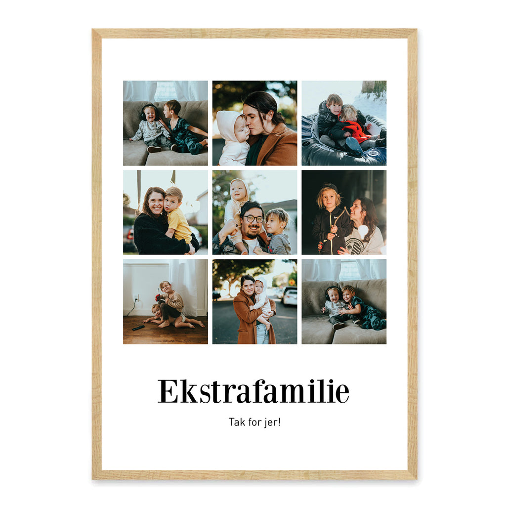 En varm og personlig plakat skabt til din ekstrafamilie, som fejrer fællesskab, kærlighed og de minder, I skaber sammen. Den hylder den støtte, omsorg og glæde, I giver hinanden, og gør det muligt at forevige alle de særlige øjeblikke, I deler. Plakaten kan tilpasses med jeres egne 6 eller 9 billeder, en personlig overskrift og tekst, som fortæller jeres unikke historie.