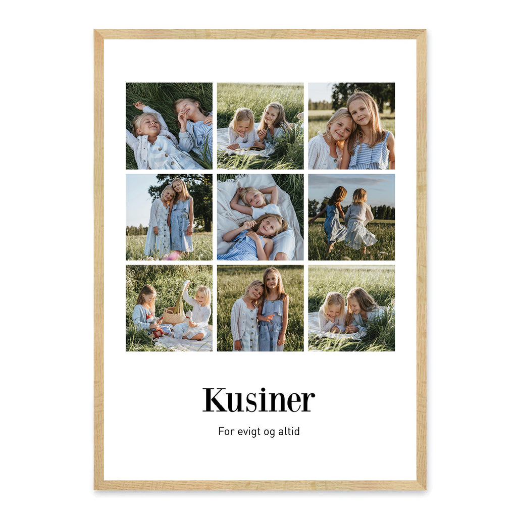 En livlig og personlig plakat til dine kusiner, der hylder det særlige fællesskab og alle de minder, I deler sammen. Den fanger grin, hyggestunder og sjove oplevelser, der gør jeres forhold helt unikt. Plakaten kan designes med dine egne 6 eller 9 billeder, en personlig overskrift og tekst, så den bliver et varmt og mindeværdigt symbol på jeres relation.