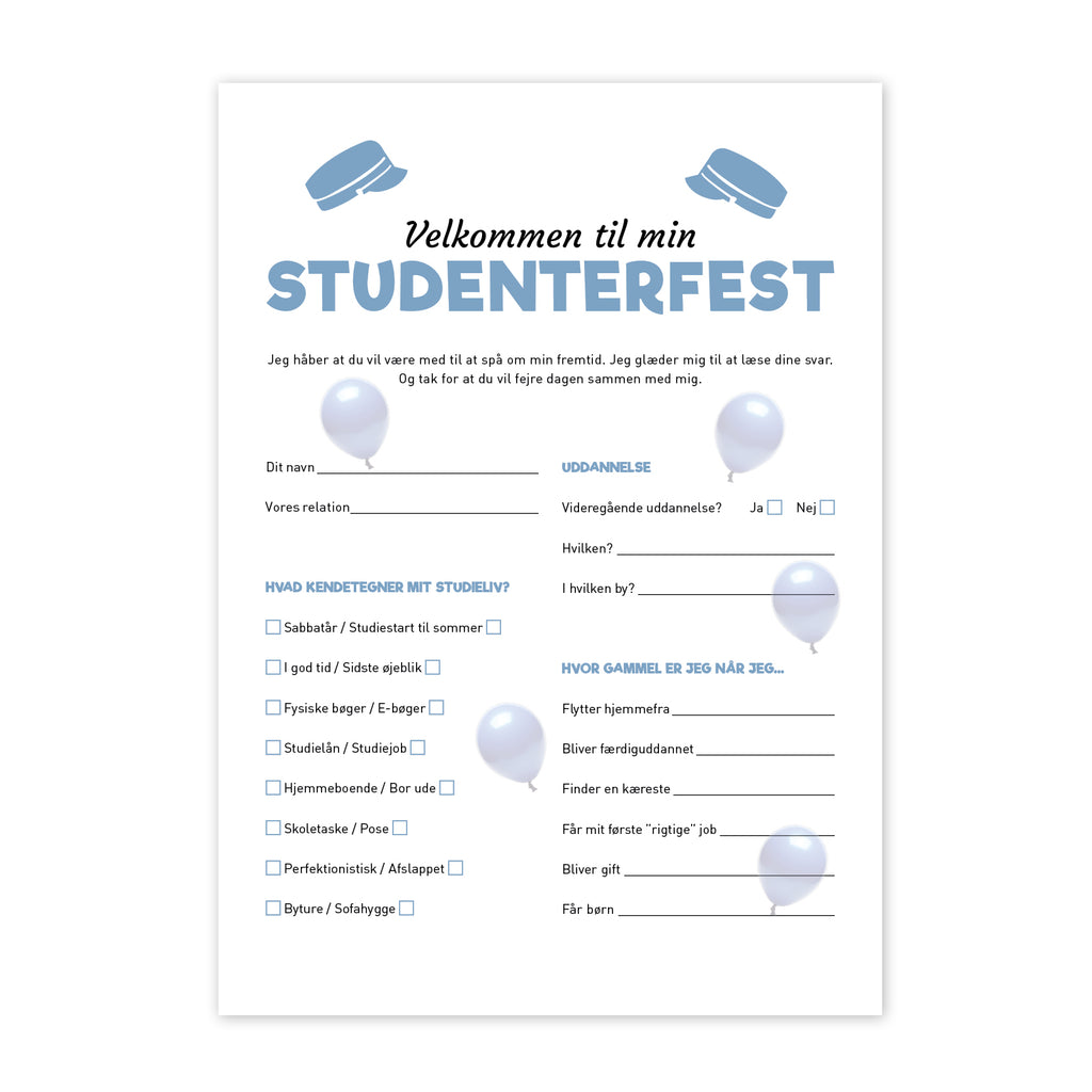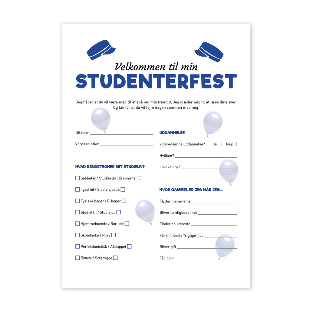 Gæsterne udfylder sjove og finurlige spørgsmål om studentens fremtid – perfekt som icebreaker eller underholdning under festen. Studenten kan bagefter gemme quizzerne som et særligt minde.