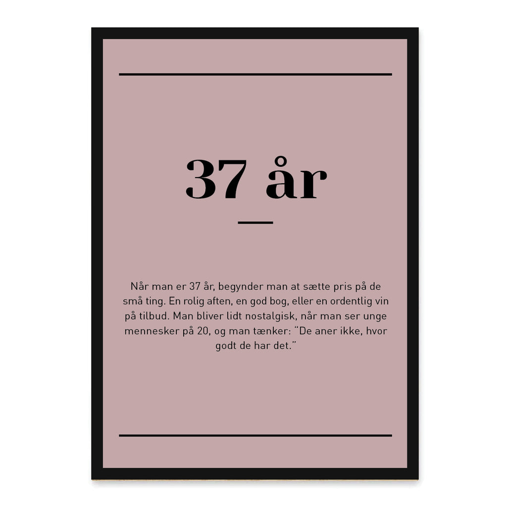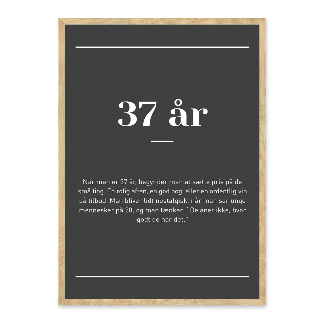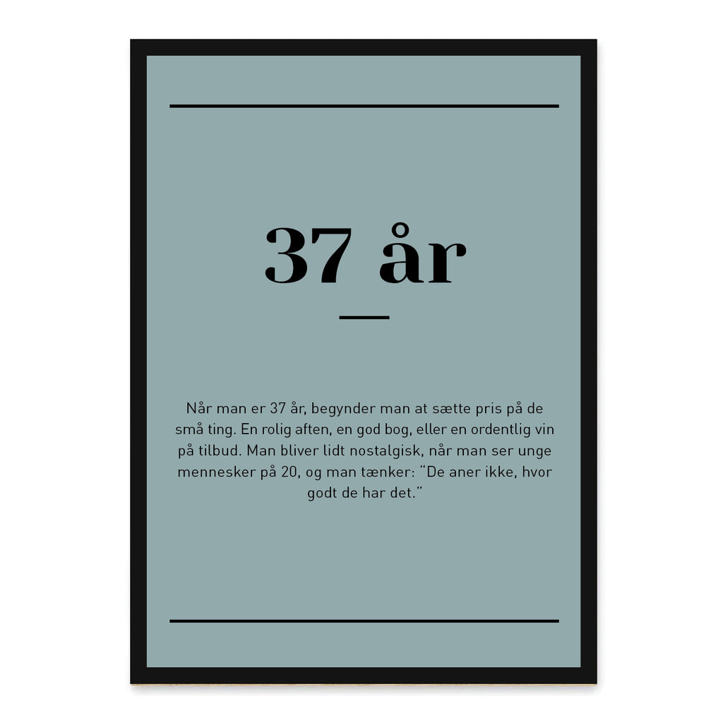 37 år – alderen hvor man har lært en del, men stadig lærer lidt hver dag (nogle gange på den hårde måde). Denne plakat beskriver med humor og varme det særlige ved at være 37 år – hvor hverdagen er fuld af erfaringer, grin og små glimt af livsvisdom.