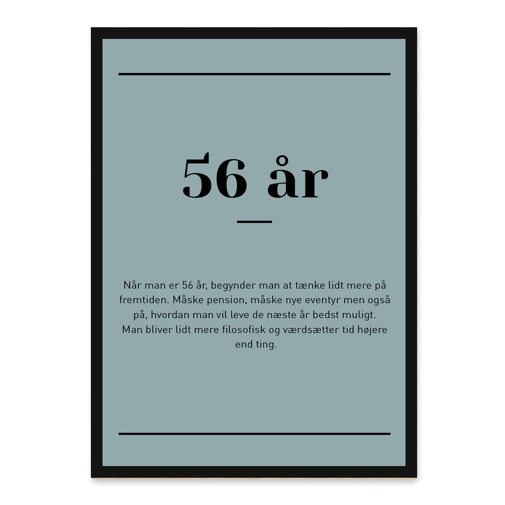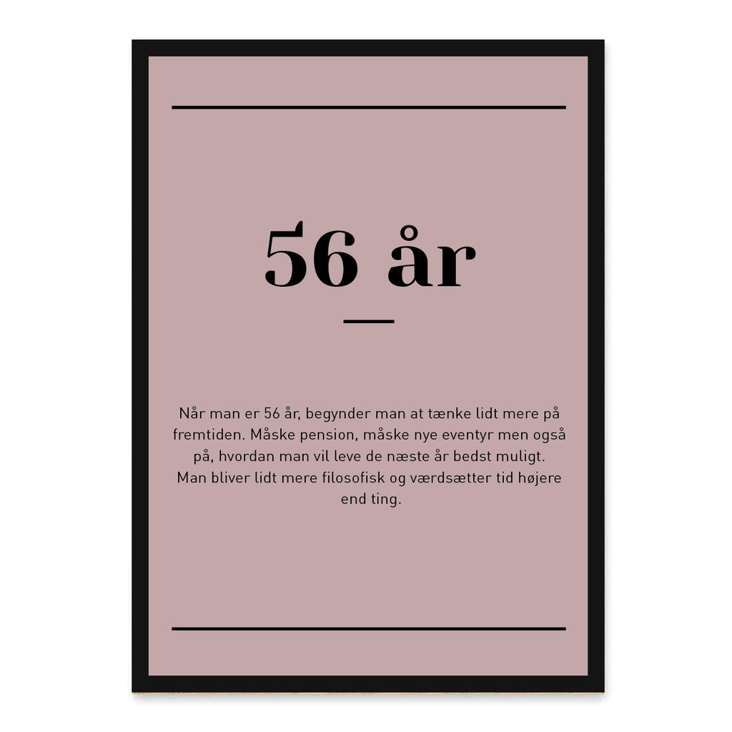 56 år – en alder hvor livserfaring og humor går hånd i hånd, og hvor man stadig nyder livets små glæder med et smil. Denne plakat beskriver med varme og selvironi det særlige ved at være 56 år – en tid med indsigt, balance og masser af gode stunder.