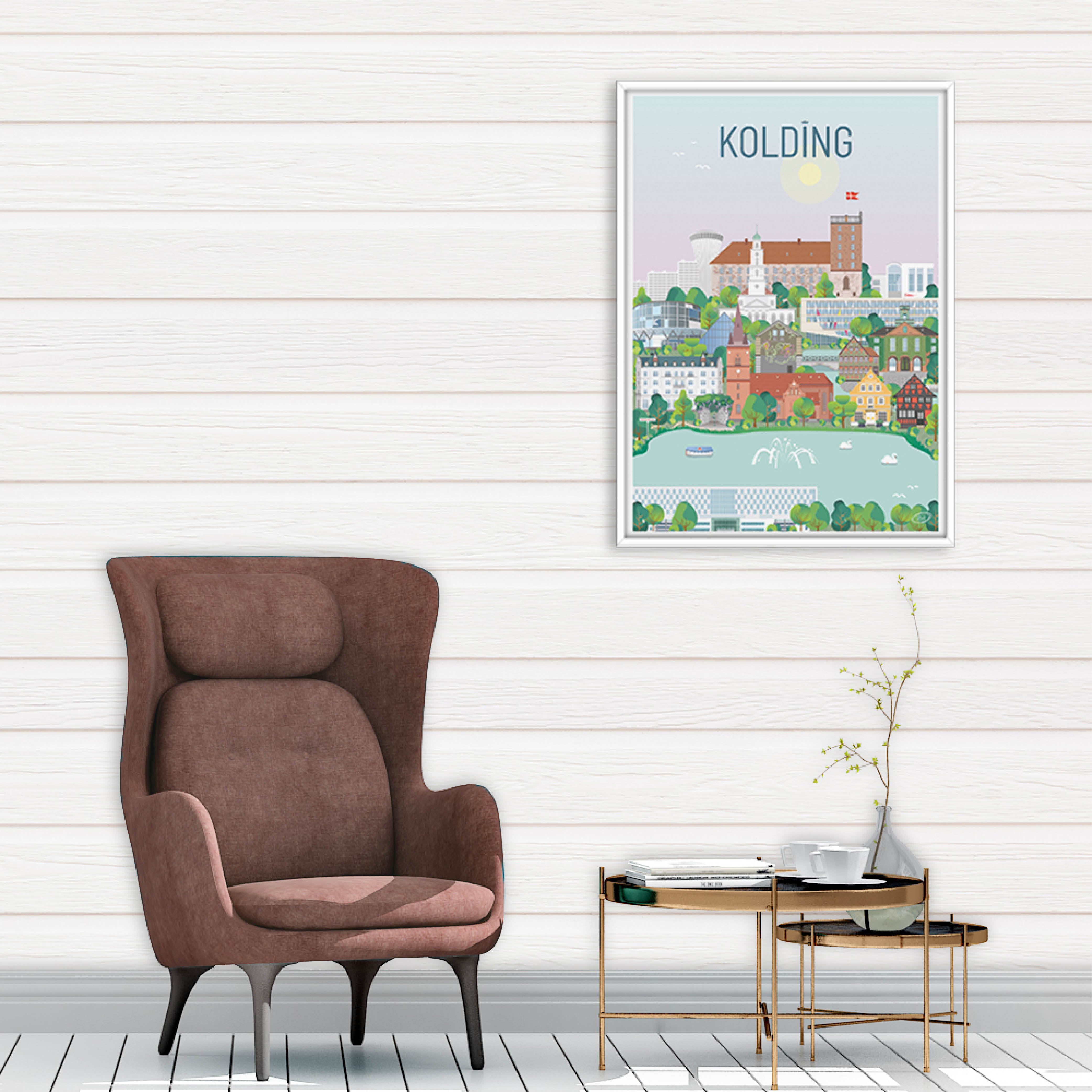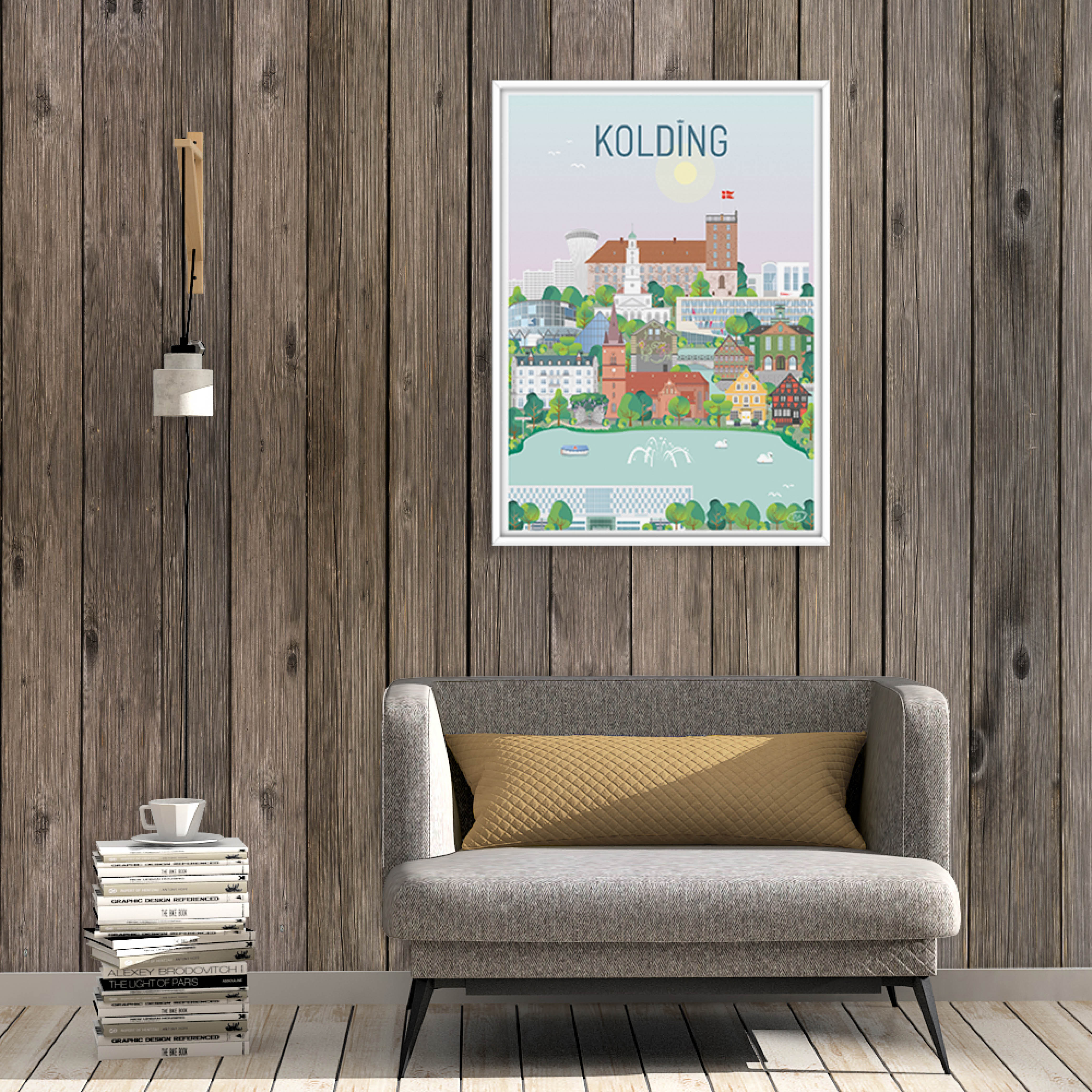 En vacker och detaljerad stadsaffisch producerad av Vilakula med motivet vackra Kolding. Här har de fångat stämningen i staden samt flera av stadens vackra byggnader. Den vackra Kolding -affischen är designad i ett färgstarkt universum som vackert kommer att dekorera väggarna i alla hem, och skapar en kontrast till de svartvita hemmen.