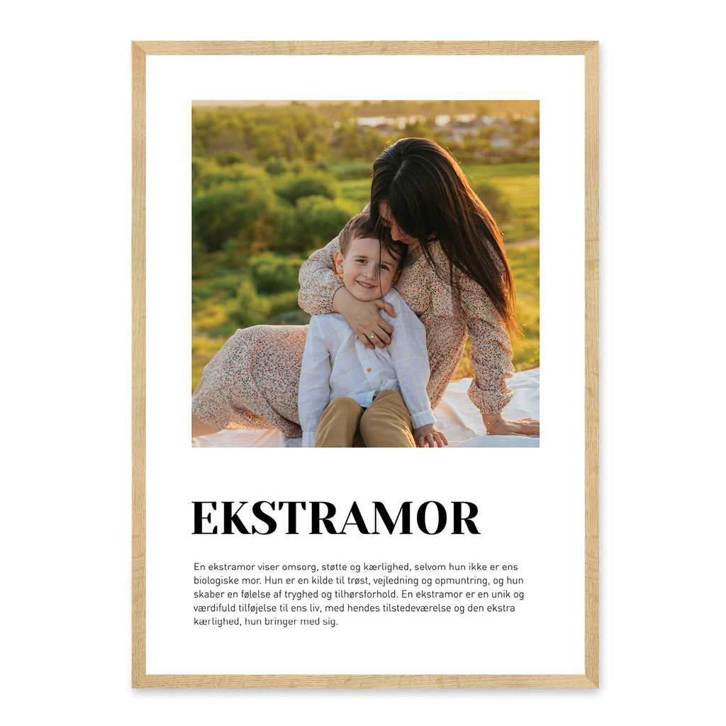Gør plakaten personlig ved at vælge mellem færdigskrevne tekster eller skrive din egen, og upload ét eller fire billeder, der indfanger jeres nærvær og de øjeblikke, der binder jer sammen. Den er en oplagt gaveidé til fødselsdag, mors dag eller som en rørende overraskelse, der viser, hvor meget din ekstramor betyder for dig. Et stilrent, nordisk design gør den til et tidløst minde, der kan pynte i enhver bolig.