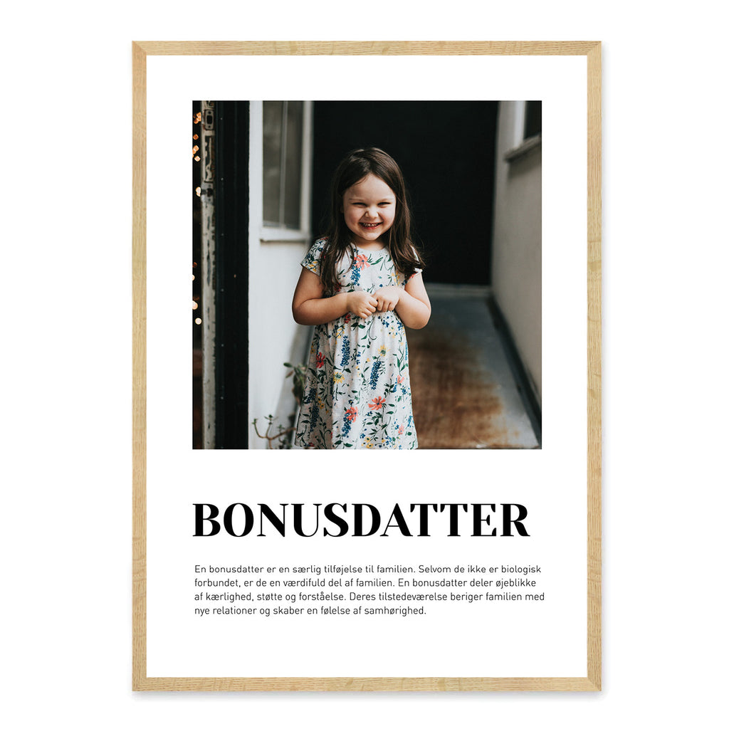 Designet kan tilpasses med ét eller fire af dine egne billeder, så plakaten får præcis det udtryk, der matcher jeres relation. Vælg mellem færdigskrevne tekster eller skriv din egen for at gøre den endnu mere personlig. Den er en oplagt gave til fødselsdag, konfirmation, jul eller blot som en kærlig overraskelse, der viser, hvor meget din bonusdatter betyder for dig. Det enkle, nordiske udtryk gør den nem at integrere i ethvert hjem – og giver en gave, der vil blive værdsat år efter år.