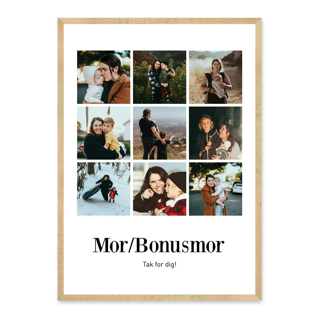 En hjertevarm plakat til en mor/bonusmor, der har spillet en helt særlig rolle i jeres liv. Den rummer både taknemmelighed, kærlighed og de mange små øjeblikke, som har formet jeres relation – uanset om hun har været der fra starten eller trådt ind senere med samme omsorg og støtte. Plakaten kan tilpasses med jeres egne 6 eller 9 billeder, en personlig overskrift og tekst, så den bliver et unikt og rørende minde om jeres bånd.