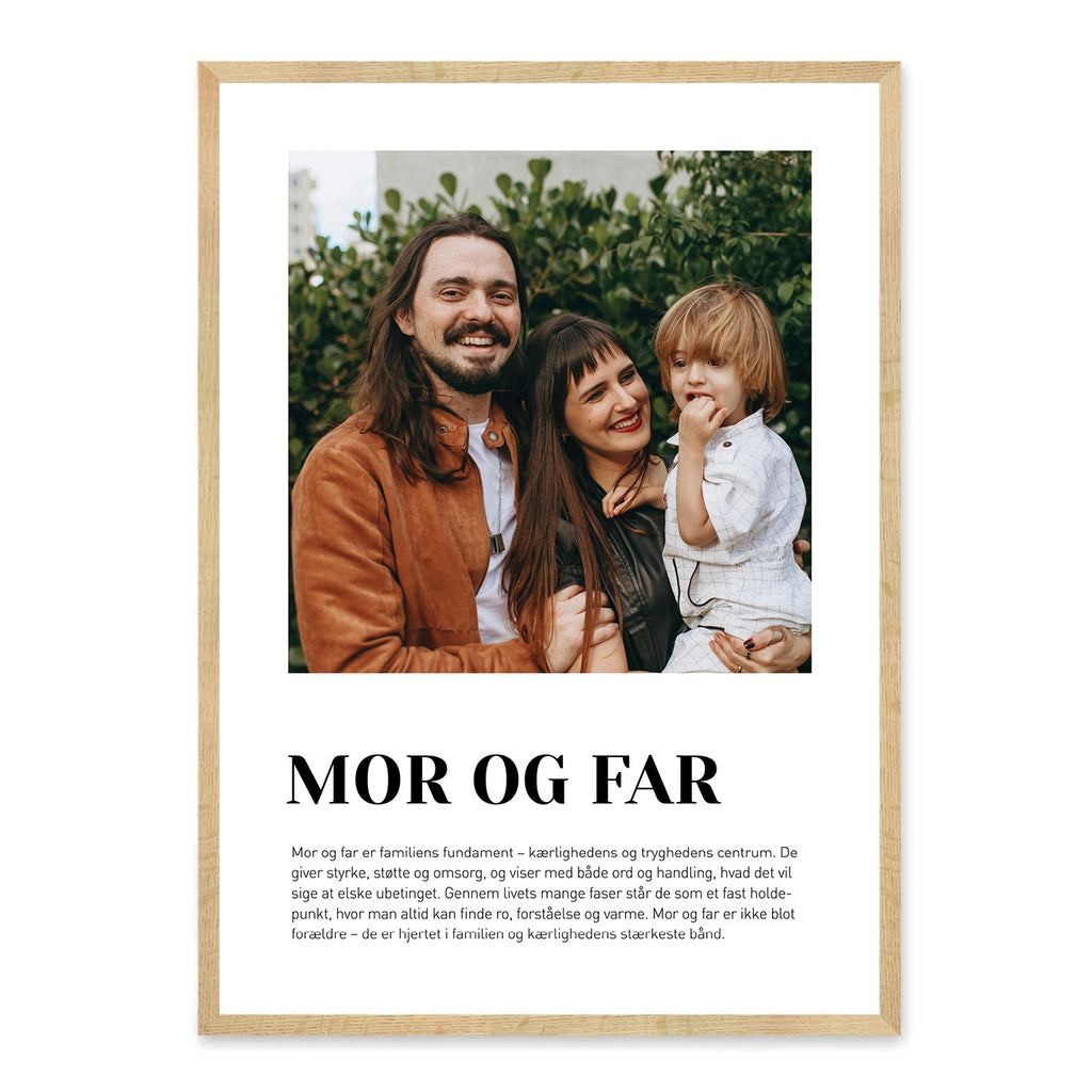 En Mor og Far-plakat er en kærlig måde at hylde den helt særlige relation, du har til dine forældre. Den fremhæver de minder, grin og små øjeblikke af nærhed, der binder jer sammen som familie, og viser, hvor stor en rolle de begge spiller i dit liv. Plakaten er en smuk måde at vise, hvor meget de betyder, og hvor taknemmelig du er for deres kærlighed og støtte.