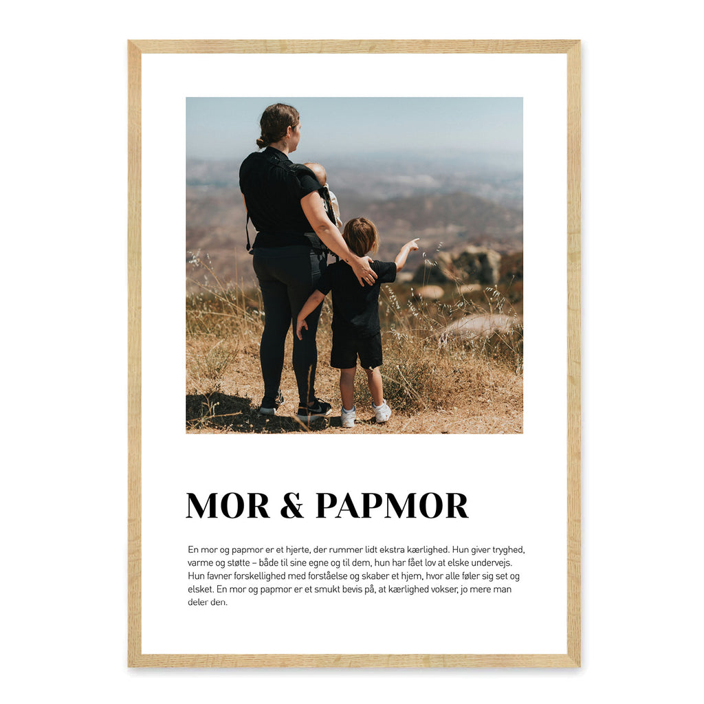 En Mor og Papmor-plakat er en kærlig måde at hylde den helt særlige relation, du har til både din mor og din papmor. Den fremhæver de minder, grin og små øjeblikke af nærhed, der binder jer sammen som familie, og viser, hvor stor en rolle de begge spiller i dit liv. Plakaten er en smuk måde at vise, hvor meget de betyder, og hvor taknemmelig du er for deres kærlighed og støtte.