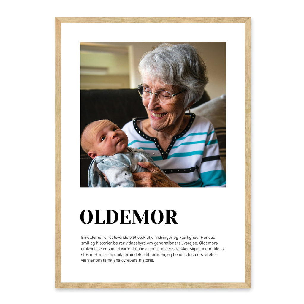 En Oldemor-plakat er en kærlig måde at hylde den helt særlige relation, du har til din oldemor. Den fremhæver de minder, grin og små øjeblikke af nærhed, der binder jer sammen som familie, og viser, hvor meget hun betyder, og hvor stor en rolle hun spiller i dit liv. Plakaten er en smuk måde at vise kærlighed og taknemmelighed for jeres unikke bånd.