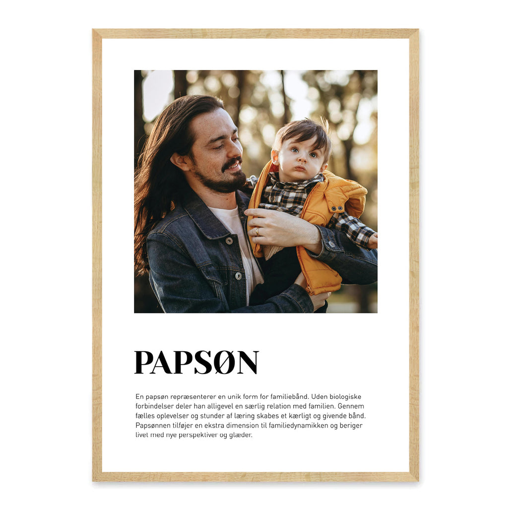 En Papsøn-plakat er en kærlig måde at hylde den helt særlige relation, du har til din papsøn – uanset om I har kendt hinanden i mange år eller først er blevet en del af hinandens liv senere. Den fremhæver de minder, grin og små øjeblikke af nærhed, der binder jer sammen som familie, og viser, hvor meget han betyder, og hvor stor en rolle han spiller i dit liv.