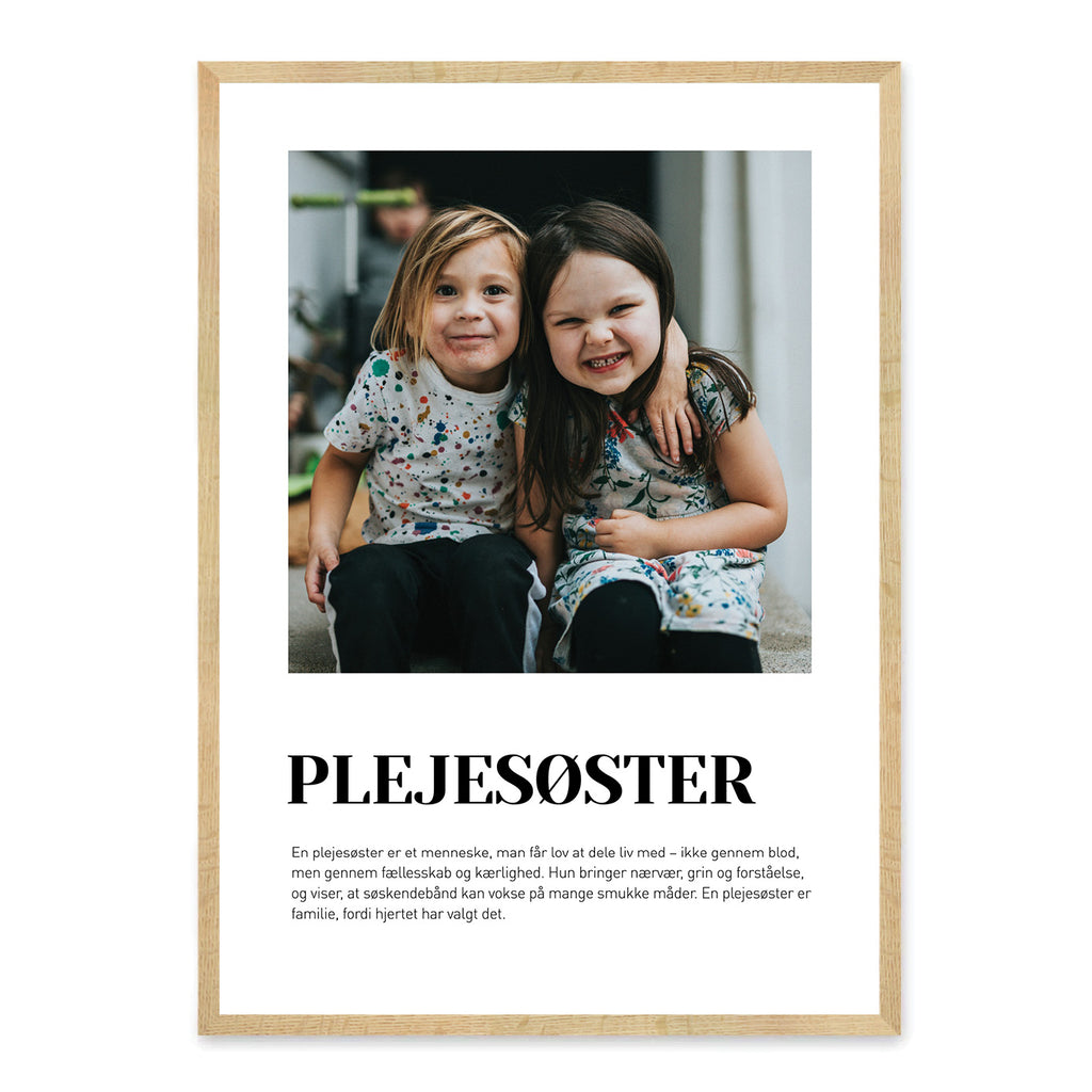 En Plejesøster-plakat er en kærlig måde at hylde den helt særlige relation, du har til din plejesøster. Den fremhæver de minder, grin og små øjeblikke, der binder jer sammen, og viser, hvor meget hun betyder for dig. Plakaten er både personlig og rørende – et smukt minde om jeres unikke bånd.