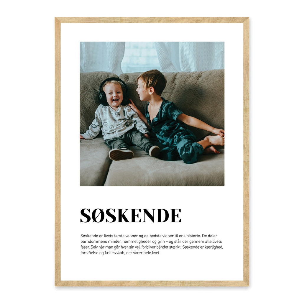 En Søskende-plakat er en kærlig måde at hylde den helt særlige relation, du har til din søster eller bror. Den fremhæver de minder, grin og små øjeblikke af nærhed, der binder jer sammen som familie. Plakaten er en smuk måde at vise, hvor meget de betyder, og hvor stor en rolle de spiller i dit liv.
