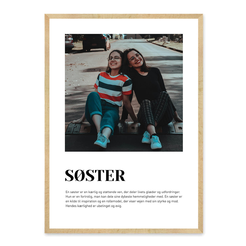 En Søster-plakat er en kærlig måde at hylde den helt særlige relation, du har til din søster – uanset om I er vokset op sammen eller har fundet hinanden senere i livet. Den fremhæver de minder, grin og små øjeblikke af nærhed, der binder jer sammen som familie. Plakaten er en smuk måde at vise, hvor meget hun betyder, og hvor stor en rolle hun spiller i dit liv.