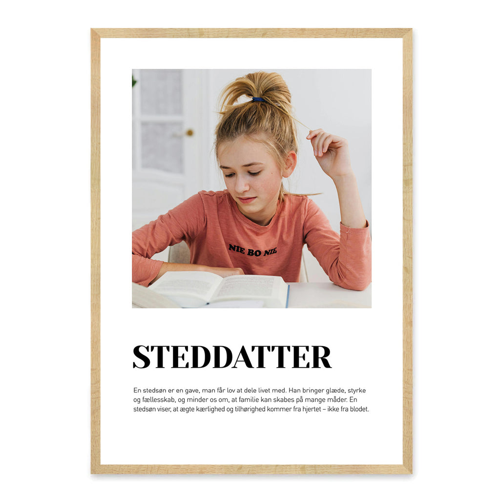 En Steddatter-plakat er en kærlig måde at hylde den helt særlige relation, du har til din steddatter. Den fremhæver de minder, grin og små øjeblikke af nærhed, der binder jer sammen som familie. Plakaten viser, hvor meget hun betyder for dig, og hvor vigtig en rolle hun spiller i dit liv.