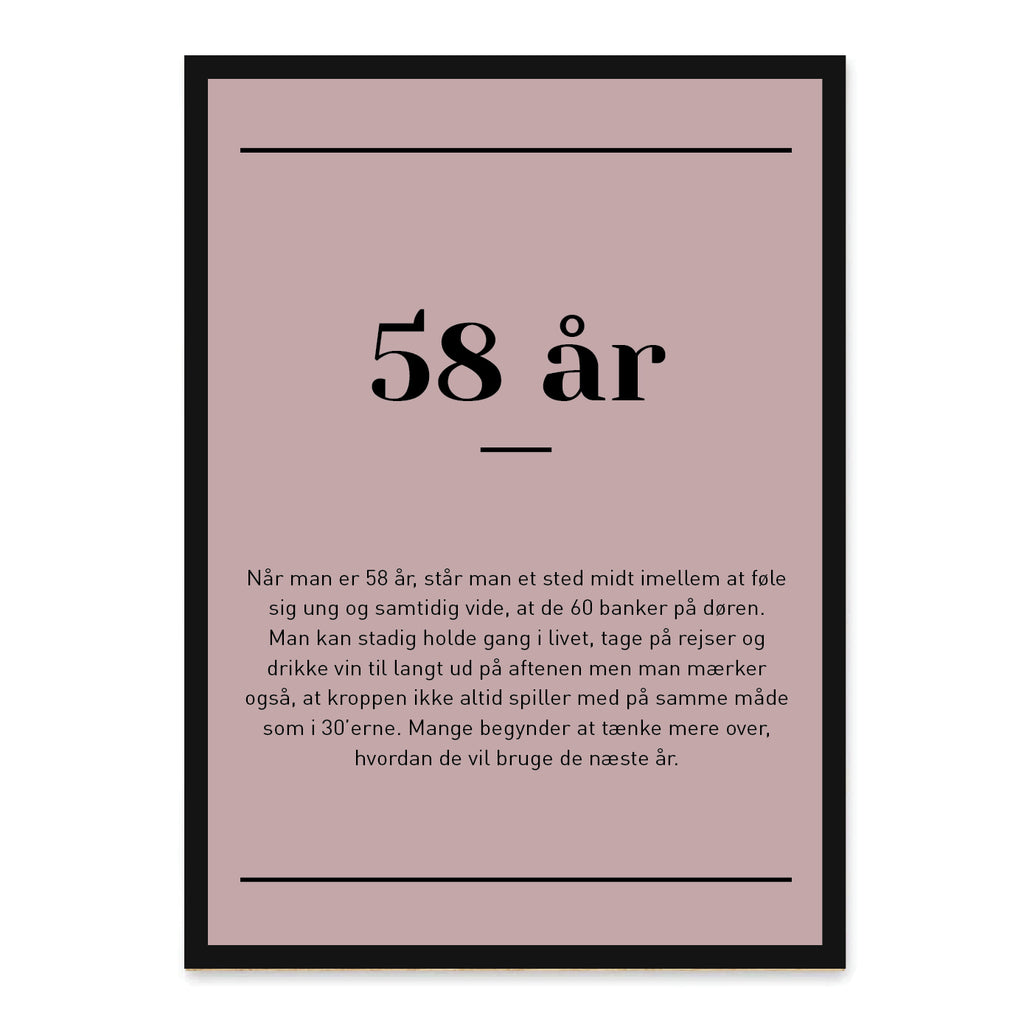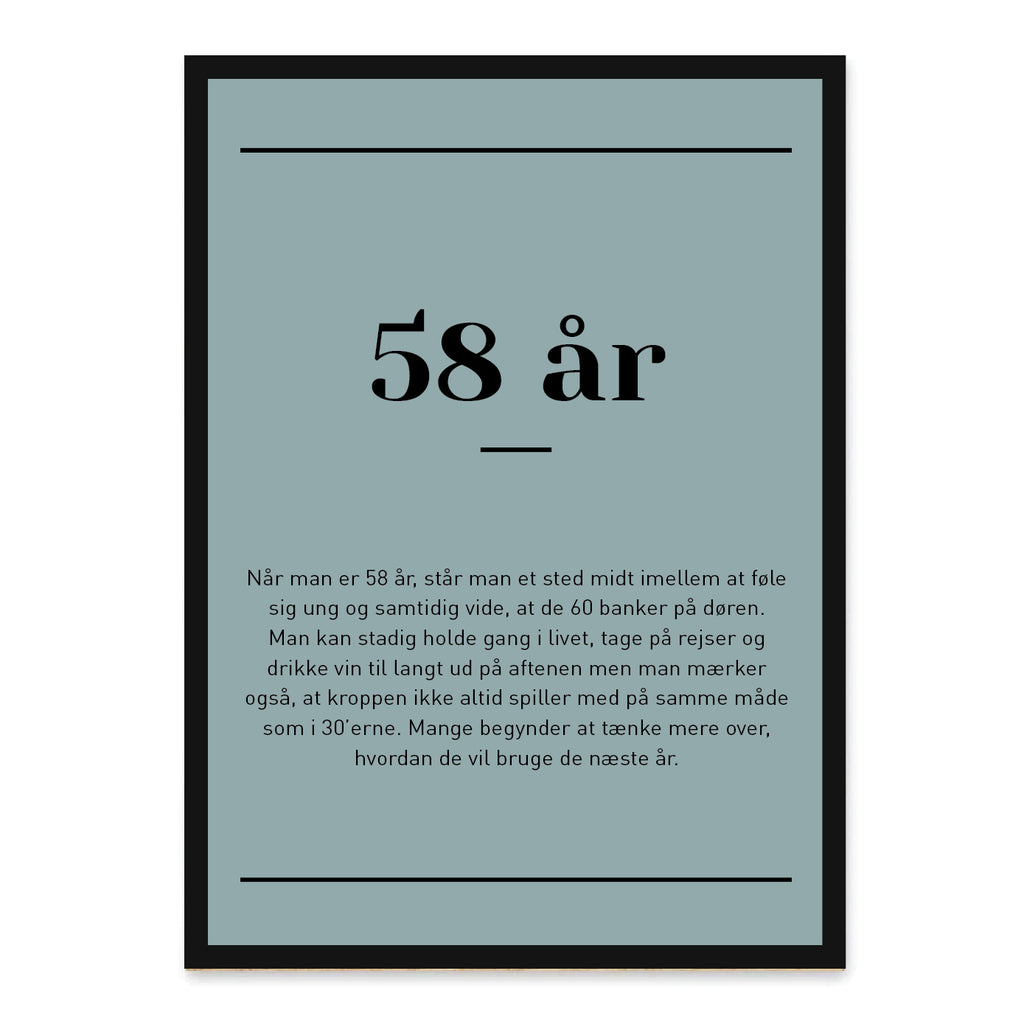 58 år – en alder hvor livets erfaringer folder sig ud med ro, selvtillid og et glimt af visdom. Man ved, hvad der betyder noget, og nyder både de små øjeblikke og de store grin. Denne plakat indfanger med varme og humor essensen af at være 58 – et sted mellem livsnyder og filosof, med hjertet fuld af minder og nysgerrighed på det, der stadig venter.
