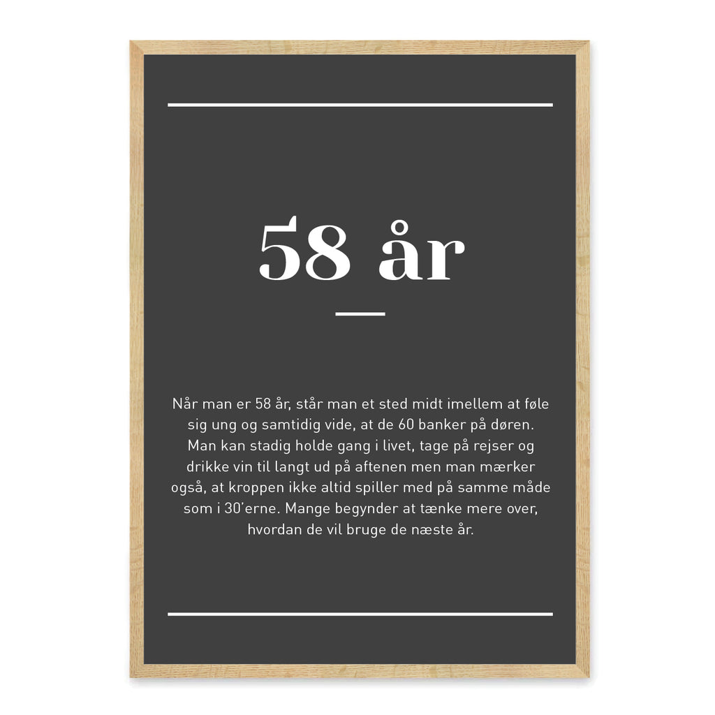 En oplagt gave til 58-års fødselsdagen eller som personlig vægdekoration. Det tidløse og enkle design passer smukt ind i enhver indretning og skaber både smil og eftertænksomhed.