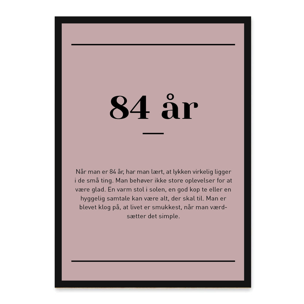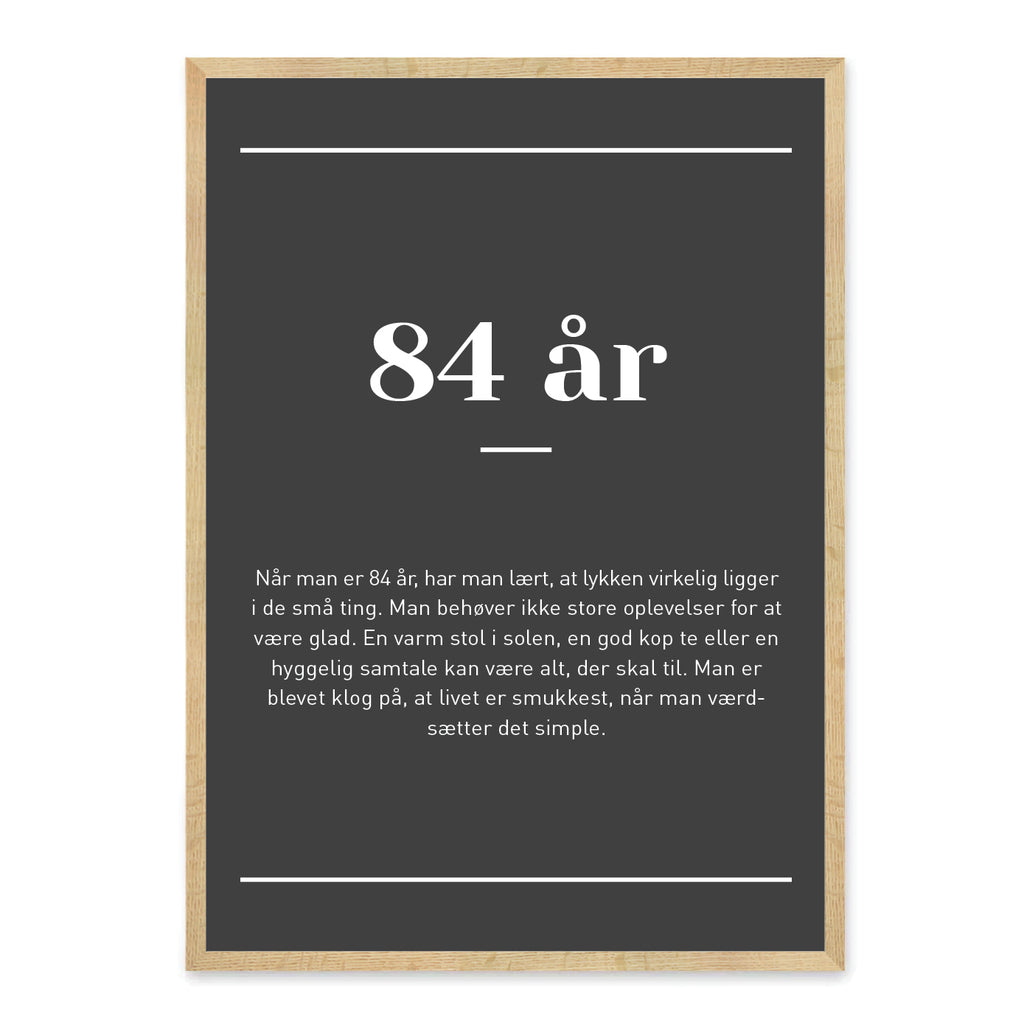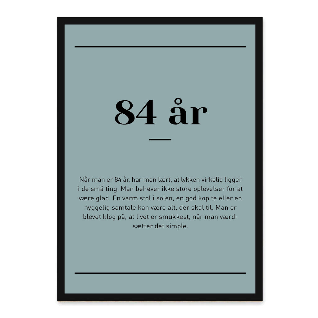 84 år – en alder fyldt med livserfaring, ro og humor. Man nyder de små øjeblikke, sætter pris på samvær med dem, man holder af, og ser livet med et smil og varme i hjertet. Denne plakat indfanger essensen af at være 84 – livsklog, afslappet og fuld af glæde.