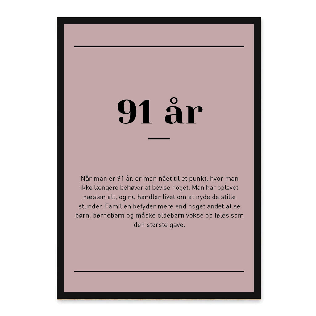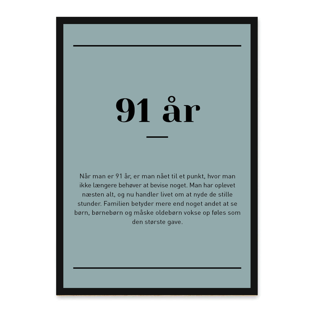 91 år – en alder hvor livets erfaring og humor mødes med ro og overskud. Man nyder de små øjeblikke, værdsætter samvær med familie og venner og tager livet med et smil. Denne plakat indfanger essensen af at være 91 – livsklog, varm og fuld af glæde.