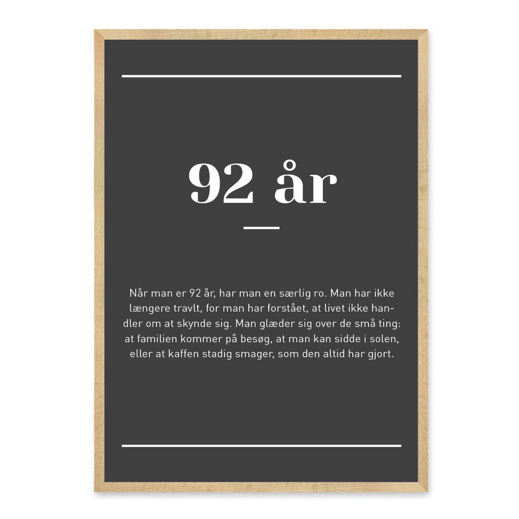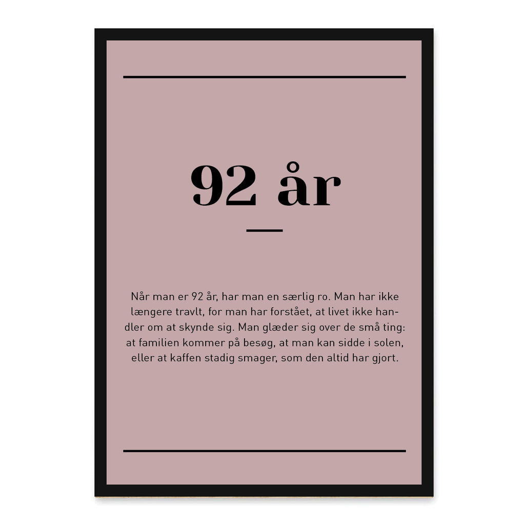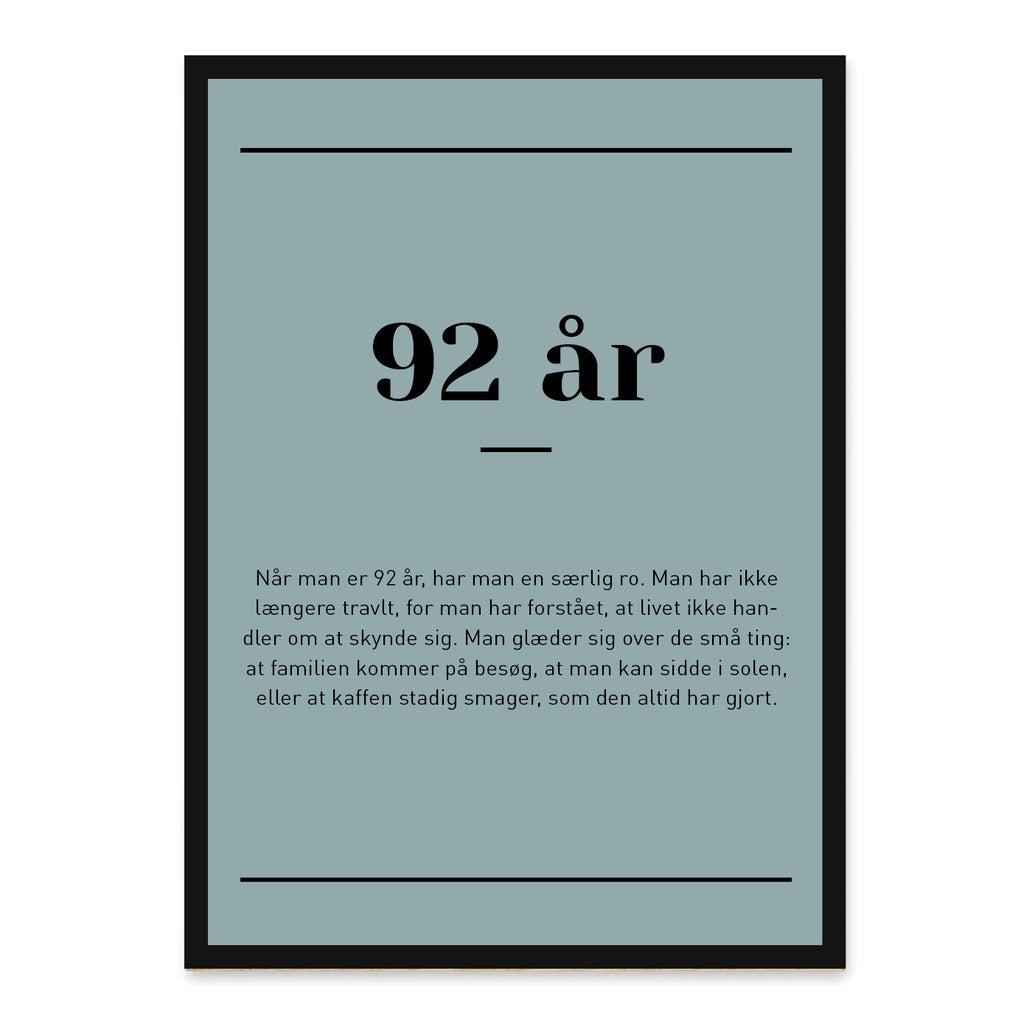 92 år – en alder fyldt med livserfaring, varme og humor. Man nyder de små øjeblikke, sætter pris på tid med familie og venner og tager livet med et smil. Denne plakat indfanger essensen af at være 92 – livsklog, rolig og fuld af glæde.