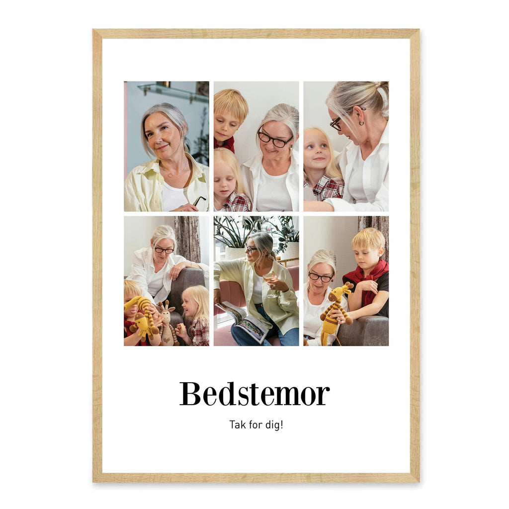 En bedstemor efterlader spor af kærlighed i alt, hvad hun gør – i krammene, historierne og de små traditioner, der gør barndommen helt særlig. Denne plakat er en hyldest til hendes varme og betydning i familien, og den samler minder fra både hverdag og højtider i et smukt udtryk. En måde at vise hende, hvor værdsat hun er. Plakaten kan designes med 6 eller 9 billeder, en titel og personlig tekst, så den bliver et kærligt portræt af jeres fælles øjeblikke.