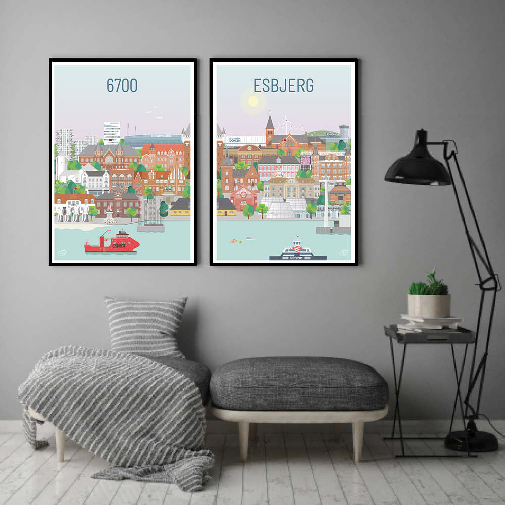 Esbjerg, Danmarks 5:e största stad och förbindelsen till Fanø. Önskar du ha en Esbjerg-affisch hängande med dig så hittar du här en riktigt färgstark och detaljerad affisch från Vilakula . Vilakula är bra på att fånga stämningen i staden in i minsta detalj. Här på affischen hittar du bl.a. Lyshøjen, Esbjerg flygplats, Esbjerg Streetfood och mycket mer. Den färgglada designen ger dig möjlighet att kontrastera de vita väggarna på ett riktigt snyggt och stilrent sätt.