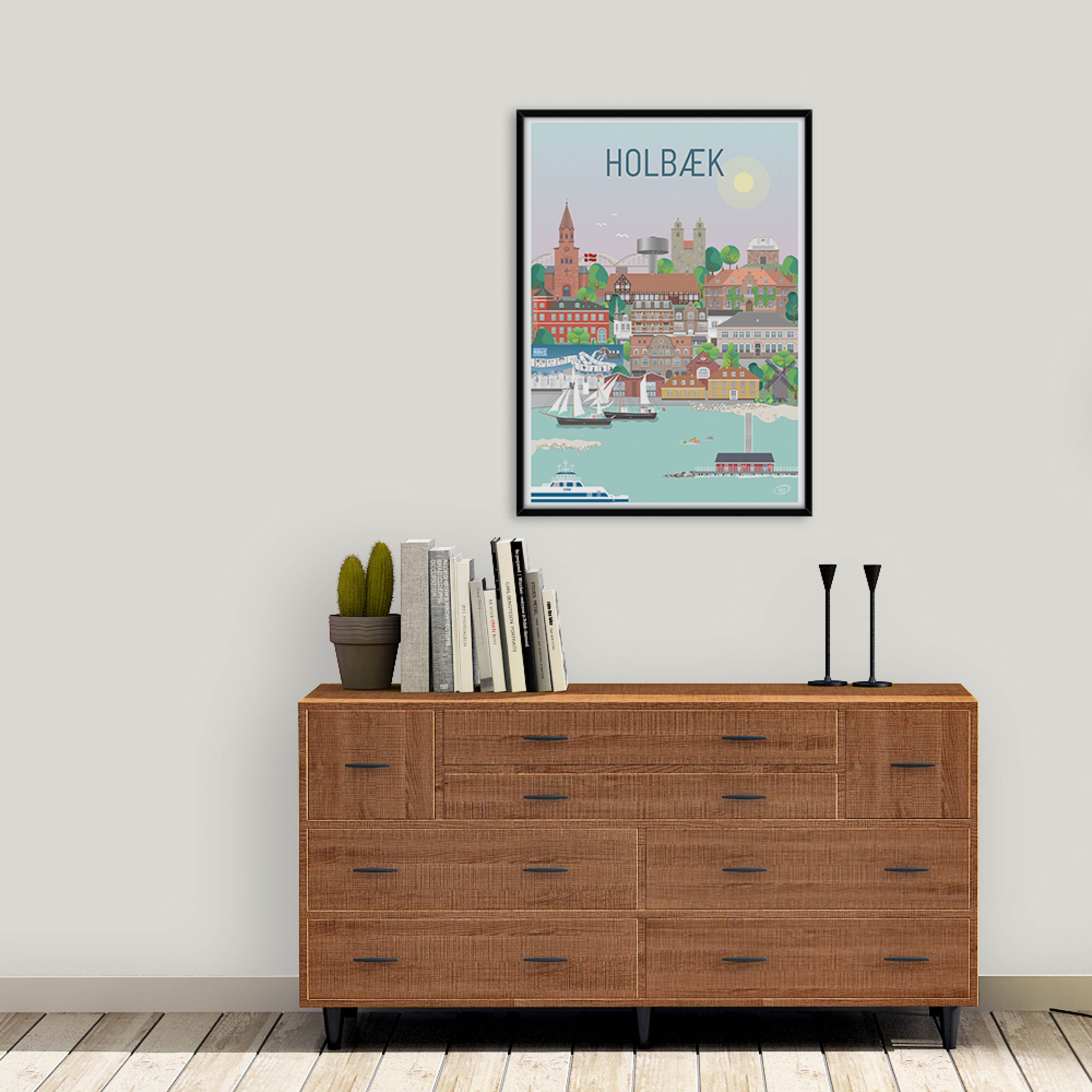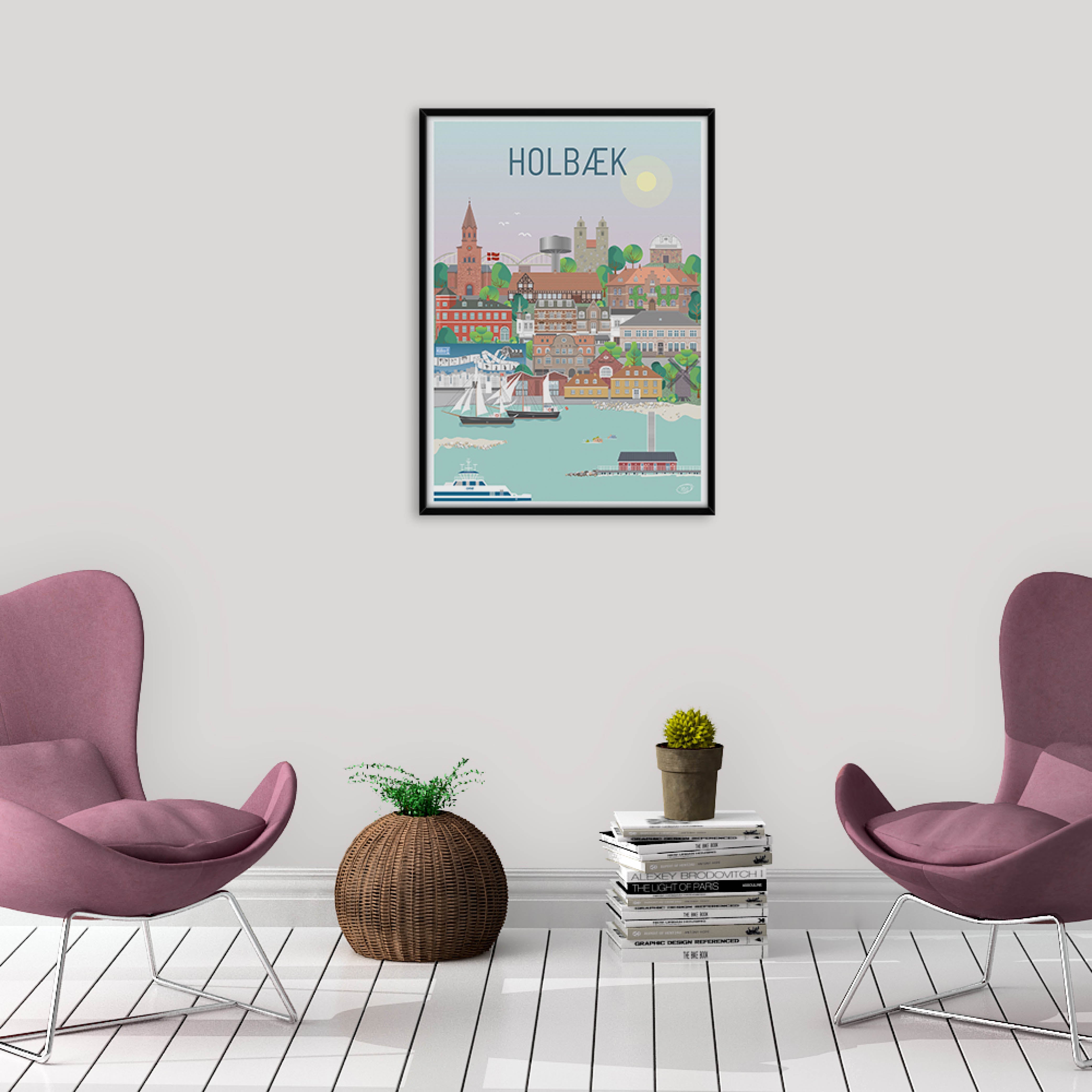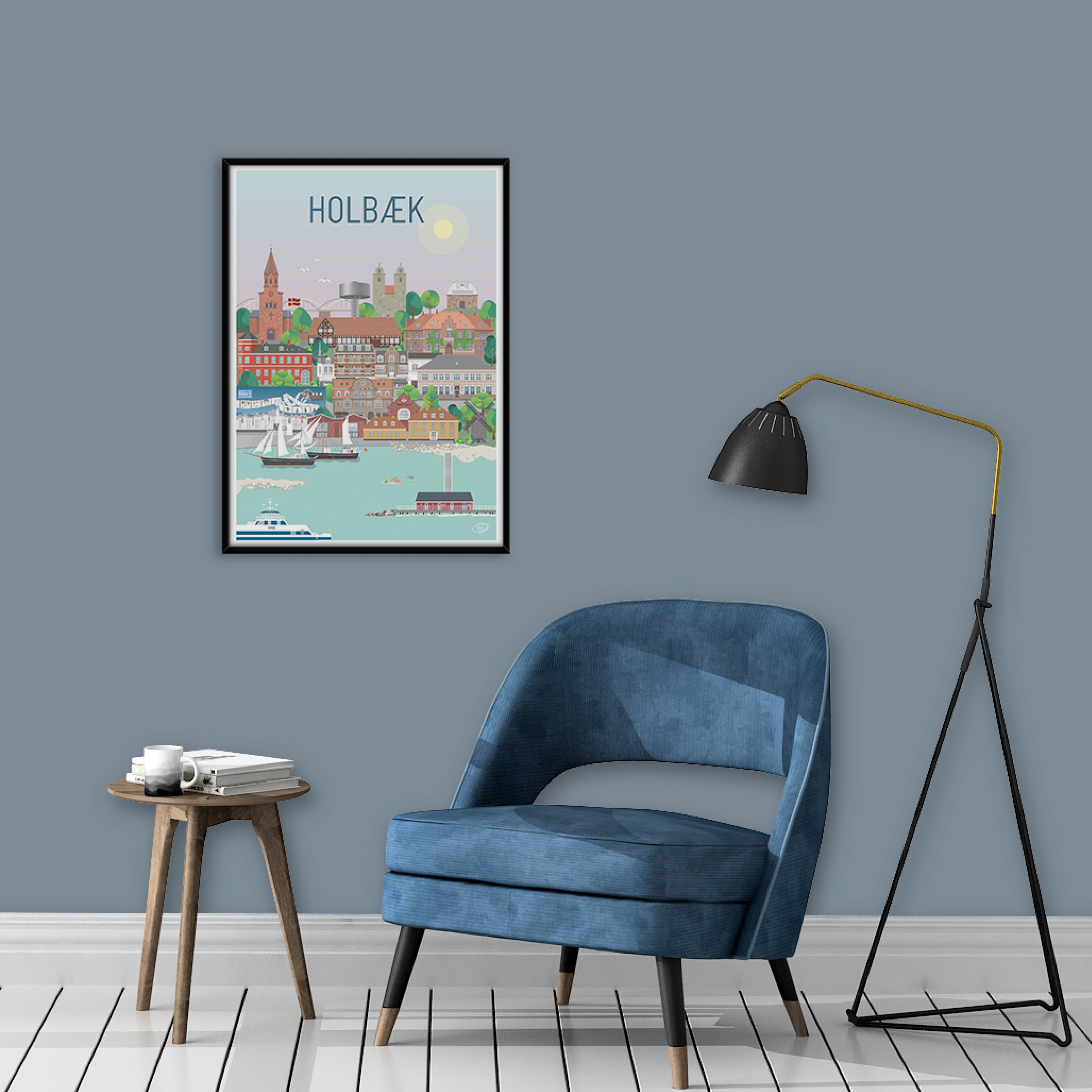 En vacker och detaljerad stadsaffisch producerad av Vilakula med motiv av vackra Holbæk. Här har de fångat stämningen i staden samt flera av stadens vackra byggnader. Den vackra Holbæk-affischen är designad i ett färgstarkt universum som vackert kommer att dekorera väggarna i varje hem, och skapar en kontrast till de svartvita hemmen.