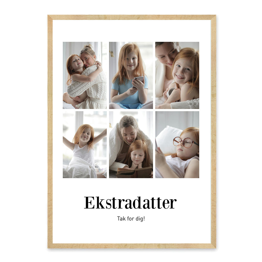 En ekstradatter bringer glæde, varme og uforglemmelige minder ind i livet. Denne plakat hylder hendes plads i familien og de særlige øjeblikke, I har delt. Plakaten kan designes med 6 eller 9 billeder, en personlig titel og tekst, så den afspejler jeres unikke historie og relation.